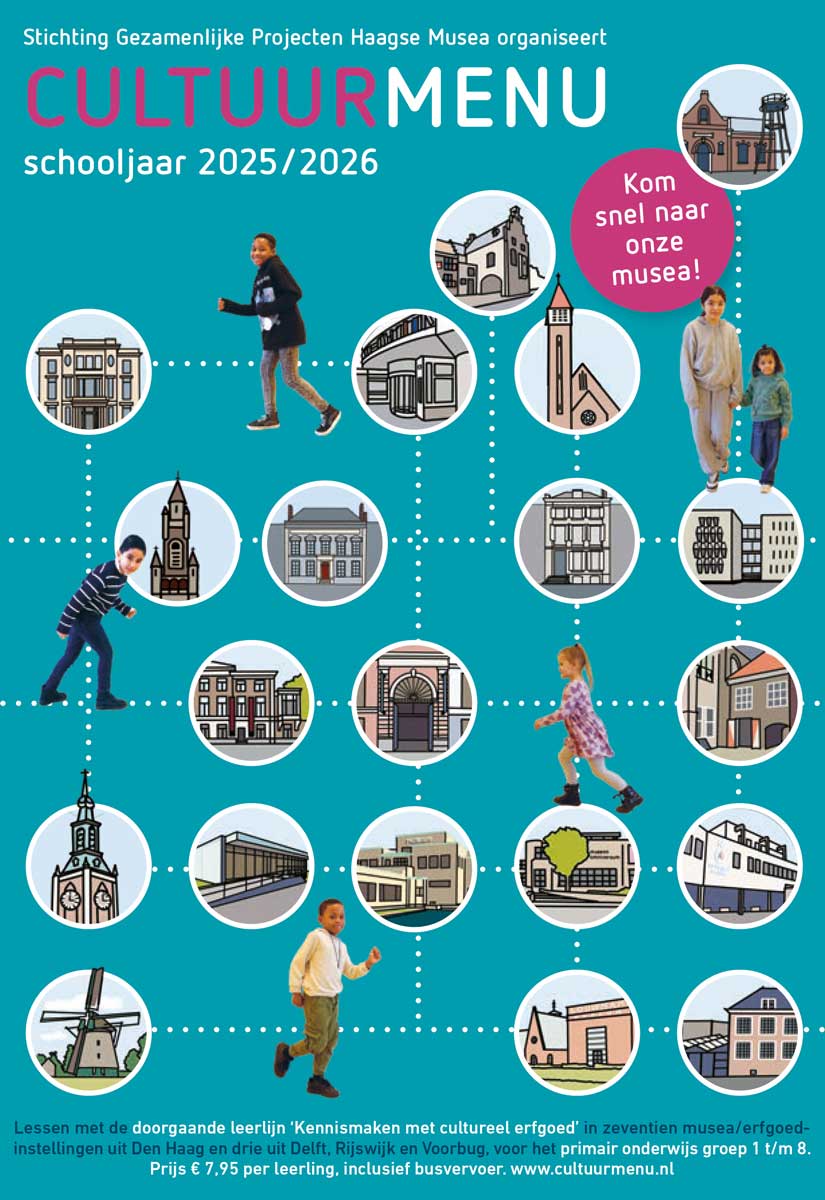 Lessen met de doorgaande leerlijn ‘Kennismaken met cultureel erfgoed’ in 17 musea/erfgoed instellingen uit Den Haag en 3 uit Delft, Rijswijk en Voorburg, voor het primair onderwijs groep 1 t/m 8. Met voorbereidend en verwerkend lesmateriaal.
